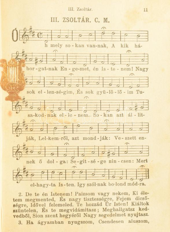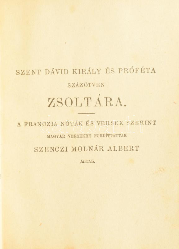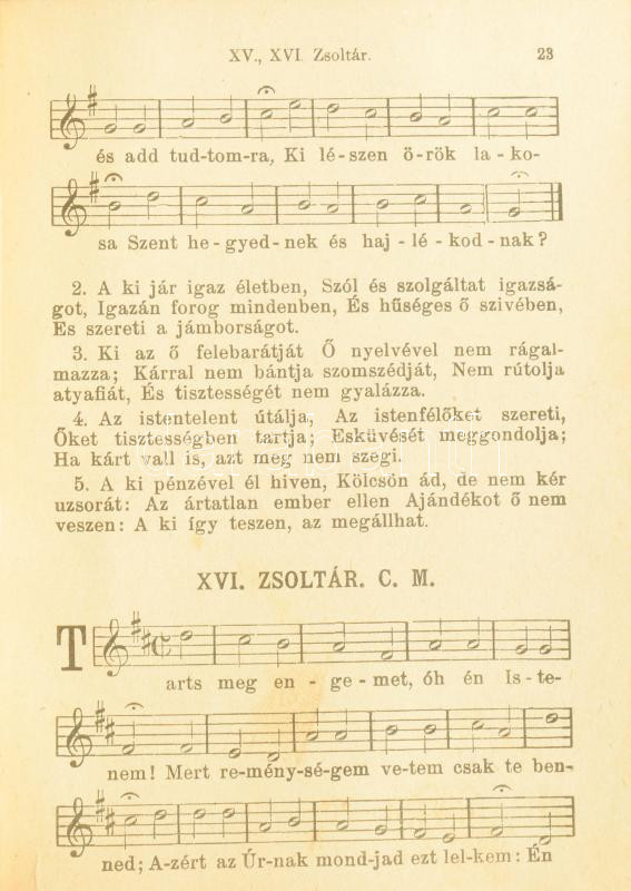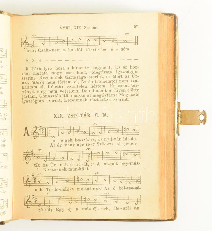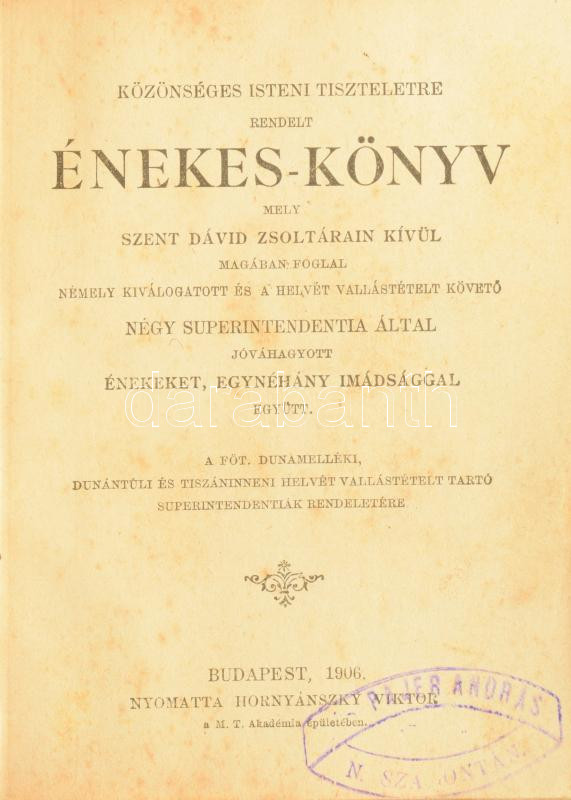 Közönséges isteni tiszteletre rendelt énekes könyv, mely Szent Dávid zsoltárain kívül magában foglal némely kiválogatott és a helvét vallástételt követő négy superintendentia által jóváhagyott énekeket, egynehány imádsággal együtt. Bp., 1906., Hornyánszky Viktor, 404 p. Korabeli bársony-kötés, bakelit kötéstáblákkal, aranyozott lapélekkel, réz csattal, eredeti dobozában, szép állapotban