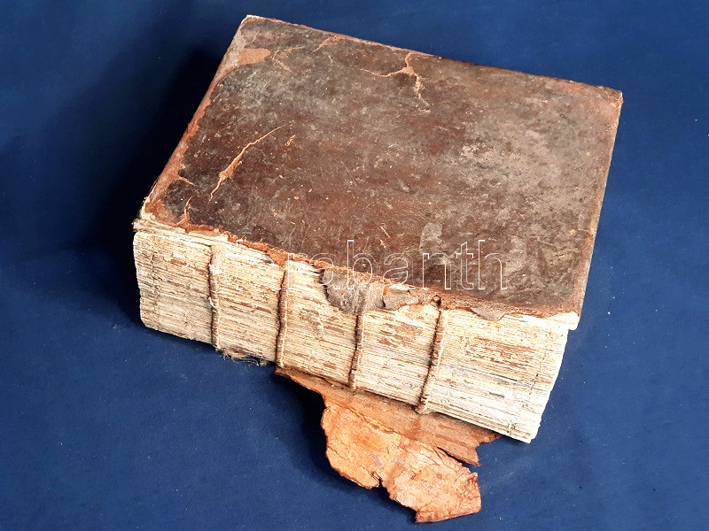 Négy bordára fűzött, sérült, hiányos gerincű, enyhén kopott korabeli bőrkötésben, kissé sérült, hiányos kötéstáblákkal, foltos lapszélekkel.