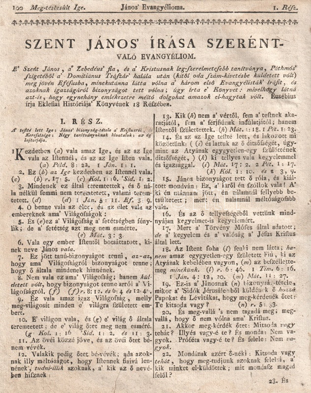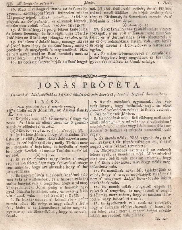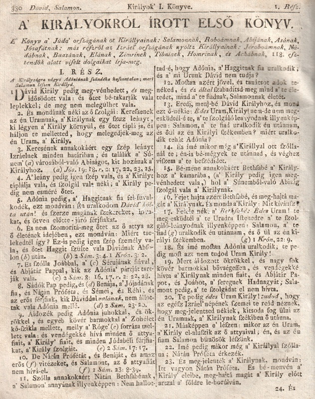 Szent Biblia, az-az: Istennek Ó és Új Testamentomában foglaltatott egész Szent Írás. Magyar nyelvre fordíttatott Károli Gáspár által. És mostan nyoltzadszor e' nagyobb formában vitettetvén a' Frantziai nótákra rendelt 'Soltár-Könyvvel egygyütt ki-botsáttatott a' Kasseli 1704-dik esztendőben nyomtattatott példa szerént. (1804).