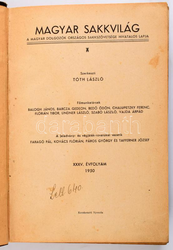 1950 Magyar Sakkvilág, a Magyar Dolgozók Országos Sakkszövetsége Hivatalos Lapja XXXV. évfolyam, szerk.: Tóth László, 12 szám könyvbe kötve