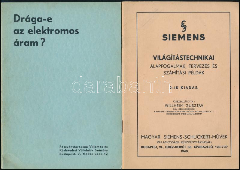 Drága-e az elektromos áram? Bp., [1934], Részvénytársaság Villamos és Közlekedési Vállalatok Számára, 31+(1) p. Kiadói tűzött papírkötés. + Wilheim Gusztáv: Világítástechnikai alapfogalmak, tervezés és számítási példák. Összeáll.: - - . Bp., 1940, Magyar Siemens-Schuckert-Művek Villamossági Rt., 47+(1) p. Második kiadás. Kiadói tűzött papírkötés.