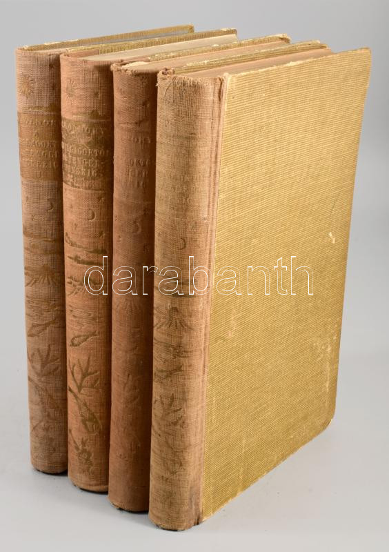 Description: Cholnoky Jenő: A csillagoktól a tengerfenékig. I-IV. köt. I. köt. A csillagok világa. II. köt. Meteorológia. III. köt. Hegyek-völgyek. IV. köt. Szárazföldek és tengerek. Bp.,é.n.,Franklin. Szövegközti és egész oldalas képekkel gazdagon illusztrálva. Egységes, aranyozott gerincű kiadói félvászon-kötésben, kopott borítóval.