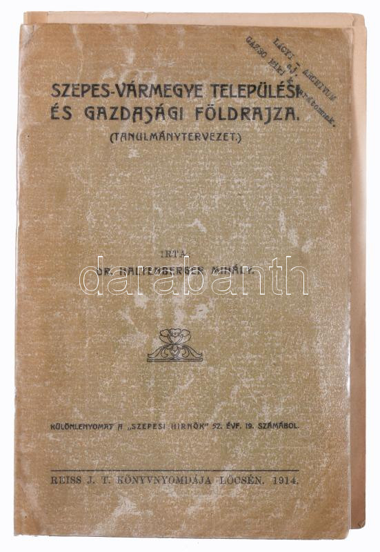 Dr. Haltenberger Mihály: Szepes-Vármegye települési és gazdasági földrajza (Tanulmánytervezet). Különlenyomat a "Szepesi hirnök" 52. évf. 19. számábol. Benne: Eltótosodás és magyarosodás Hont-megyében. Lőcse, 1914, Reiss J. T. Könyvnyomdája. Kiadói tűzött papírkötés, ragasztott, szakadt állapotban, a lapok kijárnak, belső címborítón tulajdonosi névbejegyzéssel.