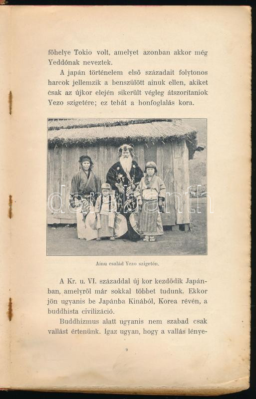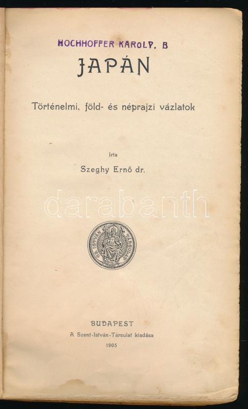 Dr. Szeghy Ernő: Japán. Történelmi, föld- és néprajzi vázlatok. Bp., 1905, Szent István-Társulat (Stephanaeum-ny.), 182+(2) p. Fekete-fehér képekkel illusztrálva. Kiadói félvászon-kötés, viseltes állapotban, kopott, foltos borítóval, foltos lapokkal, az elülső szennylapon bejegyzésekkel.