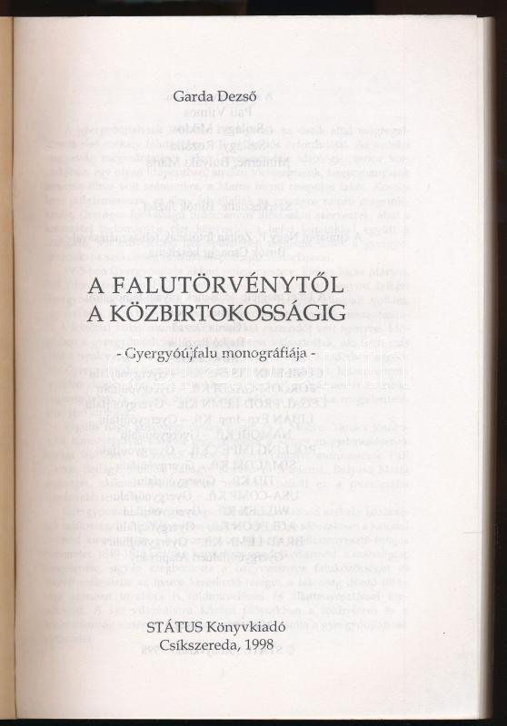 Garda Dezső: A falutörvénytől a közbirtokosságig. Gyergyóújfalu monográfiája. Csíkszereda, 1998, Státus, 283+(1) p. Kiadói papírkötés. Megjelent 1000 példányban.