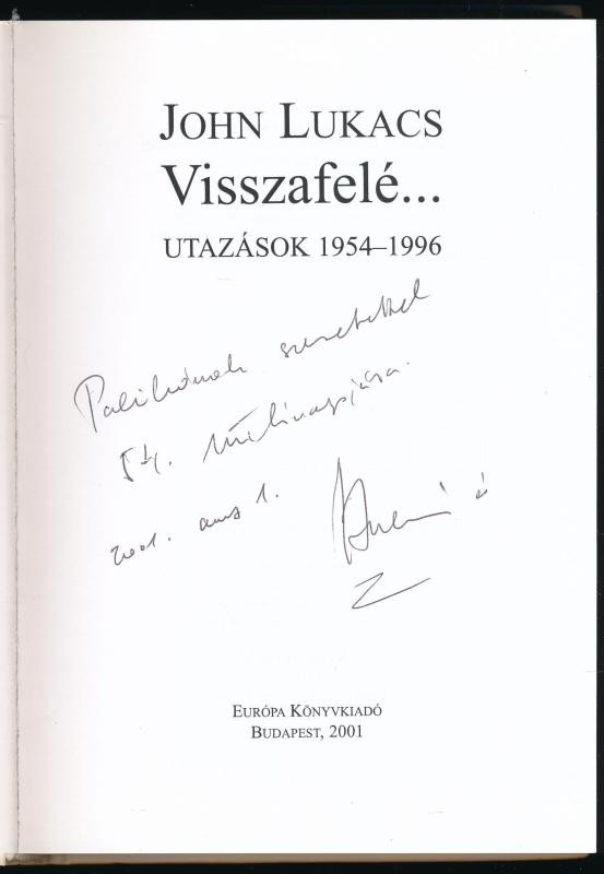John Lukács: Visszafelé...Utazások 1954-1996. Ford.: Borbás Mária, Barkóczi András. Bp., 2001, Európa. Kiadói kartonált papírkötés, kissé viseltes kiadói papír védőborítóban, ajándékozási bejegyzéssel.