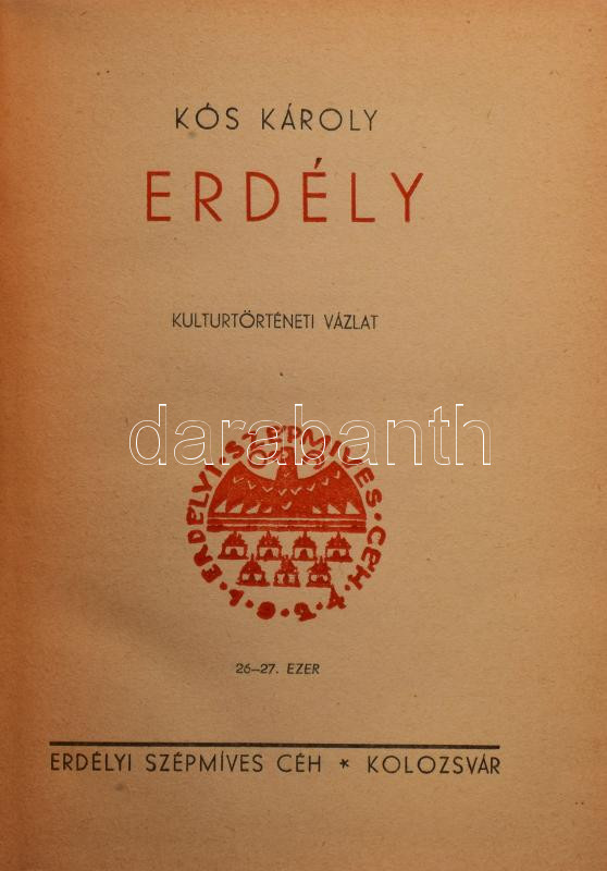 Kós Károly: Erdély. Kultúrtörténeti vázlat. Kolozsvár, Erdélyi Szépmíves Céh. Kiadói egészvászon kötés, gerinc sérült, kopottas állapotban.