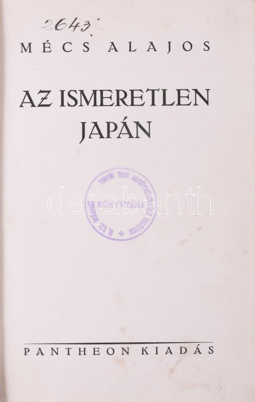 Mécs Alajos: Az ismeretlen Japán. Bp., 1942, Pantheon. Első kiadás. Kiadói vászon-kötés, laza fűzés. intézményi bélyegzőkkel