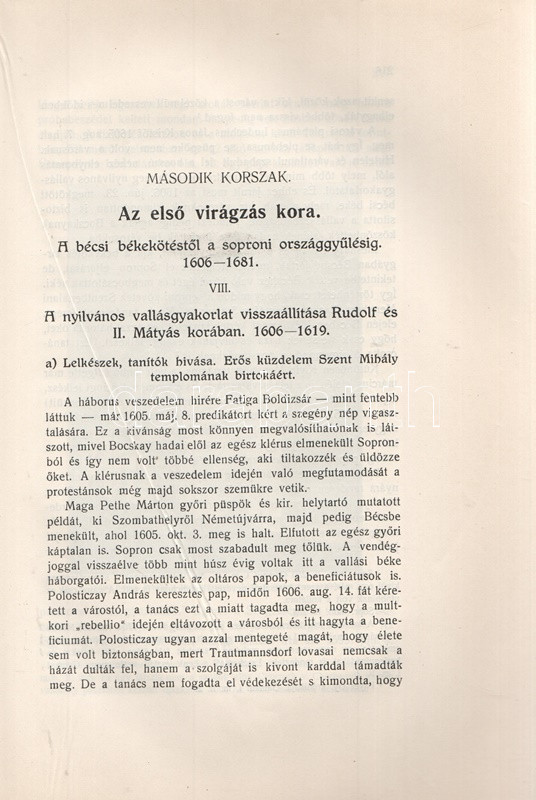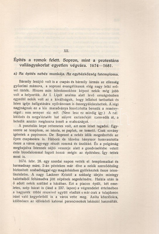 Payr Sándor: A soproni evangelikus egyházközség története. A reformáció négyszázados jubileumára. Gamauf Teofil soproni lelkész kézirati hagyatékának felhasználásával írta Payr Sándor. I. kötet. A reformáció kezdetétől az 1681-ik évi soproni országgyűlésig. [Unicus, nem jelent meg több rész.] Sopron, 1917. Soproni Ágostai Hitvallású Evangelikus Egyházközség - Piri és Székely könyvnyomdája. VIII + 521 + [1] p. Egyetlen kiadás. Payr Sándor (1861-1938) evangélikus lelkész, egyháztörténész, a soproni evangélikus teológiai akadémia tanára. Társadalomtörténeti keretbe ágyazott egyháztörténeti monográfiája a soproni reformáció történetét tekinti át, a huszita kezdetektől a Habsburg-adminisztráció által támogatott katolikus restaurációig, amely számottevően csorbította a város protestánsainak vallási jogait. Oldalszámozáson belül szövegközti grafikákkal, felvételekkel gazdagon illusztrálva. Fűzve, feliratozott kiadói borítóban. Jó példány.