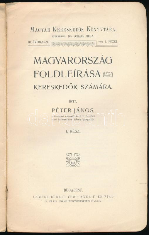 Description: Péter János: Magyarország földleírása kereskedők számára. I. rész. Magyar Kereskedők Könyvtára III. évf. 1. füzet. Bp., Lampel R., 96 p. Kiadói papírkötés, viseltes borítóval, sérült gerinccel.