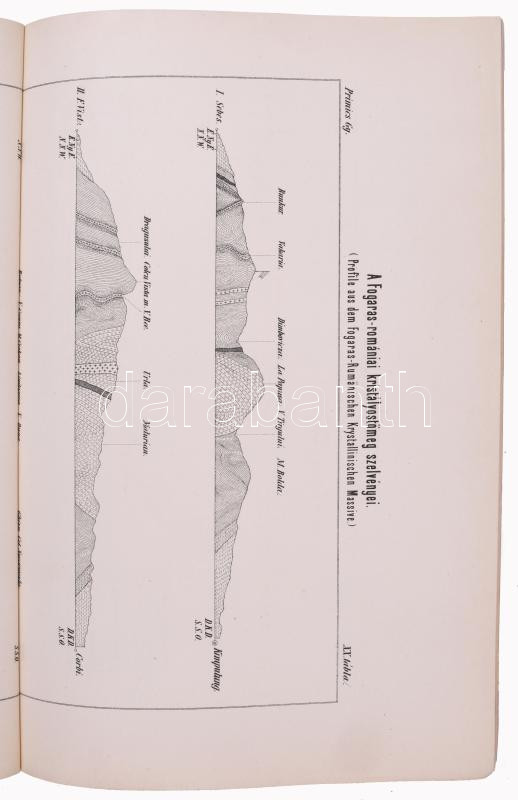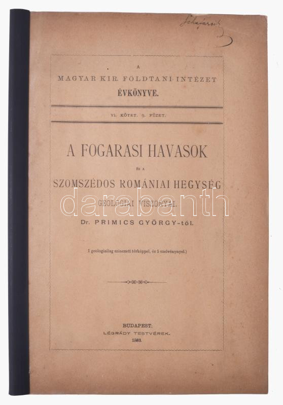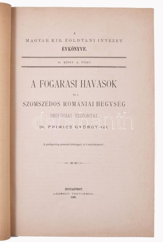 Primics Görgy, Dr.: A Fogarasi havasok és a szomszédos romániai hegység geológiai viszonyai. (1 geologiailag szinezett térképpel, és 5 szelvénnyel.) Budapest, 1883. [Magyar Királyi Földtani Intézet], (Légrády Testvérek ny.). [3], 272-298, [1] p. 1 térkép. 1 t. Fűzve, kiadói papírkötésben, védőkötésben