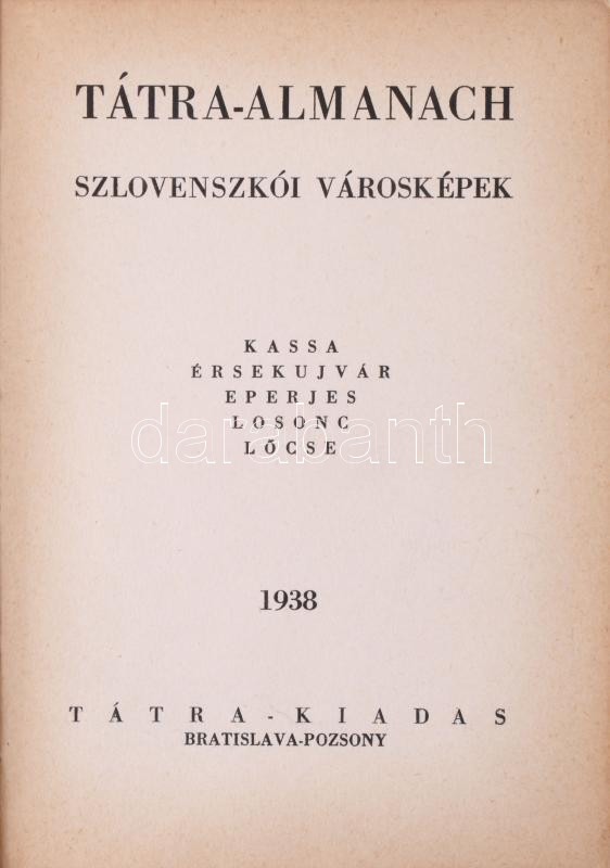 Tátra-Almanach. Szlovenszkói városképek. Kassa, Érsekújvár, Eperjes, Losonc, Lőcse. Tátra-könyvek. I. sorozat. 3. kötet. Pozsony, 1938, Tátra-Kiadás. Kiadói egészvászon-kötés kisebb sérülésekkel.