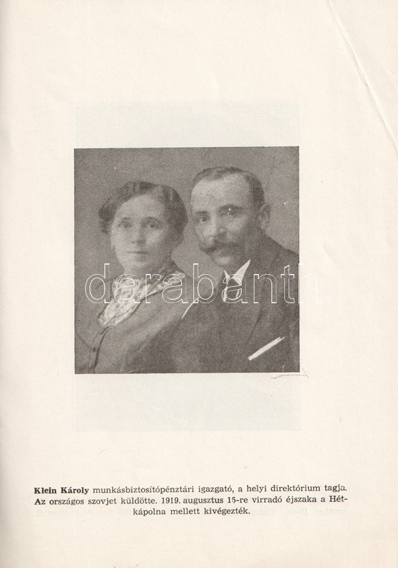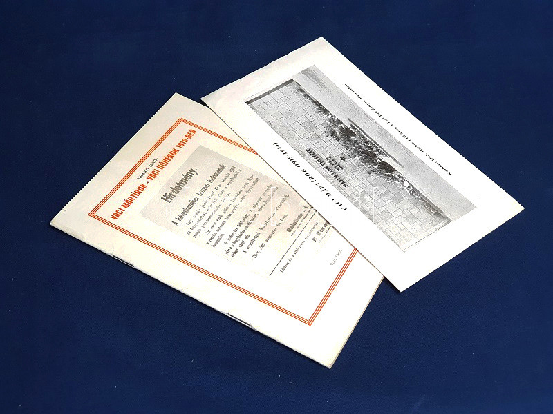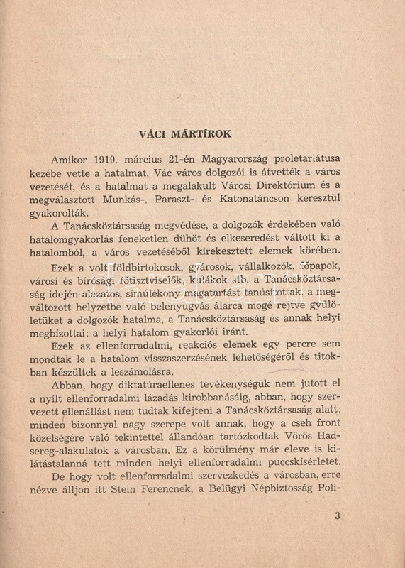 Tihanyi Ernő (1897-1967) vasmunkás, mozgalmár, közoktatásügyi népbiztos, elítélt, író, költő, újságíró, 1945-öt követően váci lakos, váci múzeumigazgató és néhány művet közzé tevő váci helytörténész. Összesen 2000 példányban megjelent munkája a Tanácsköztársaság bukását követő megtorlás eseményeit elemzi, szenvedélyesen elítélő hangnemben. Táblaanyagán a mártírként méltatott váci vörös katonák és tisztviselők arcképcsarnoka. Kötetünk a Váci Vak Bottyán Múzeum "Váci mártírok, 1919-1944" című időszakos tárlatához kapcsolódik (1963. október 1. - 1963. október 23.), melynek egyleveles brosúráját az egykori tulajdonos elhelyezte füzetünkben.
