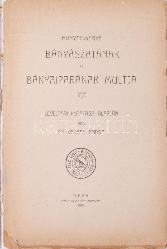 Veress Endre: Hunyadmegye bányászatának és bányaiparának múltja. Levéltári kutatásai alapján írta ? ?.Déva, 1910. Hirsch Adolf. 39 p. /Klny. a Hunyadmegyei tört. társ. 1910-iki XX. évk./ Fűzve, kiadói borítóban, javított gerinccel