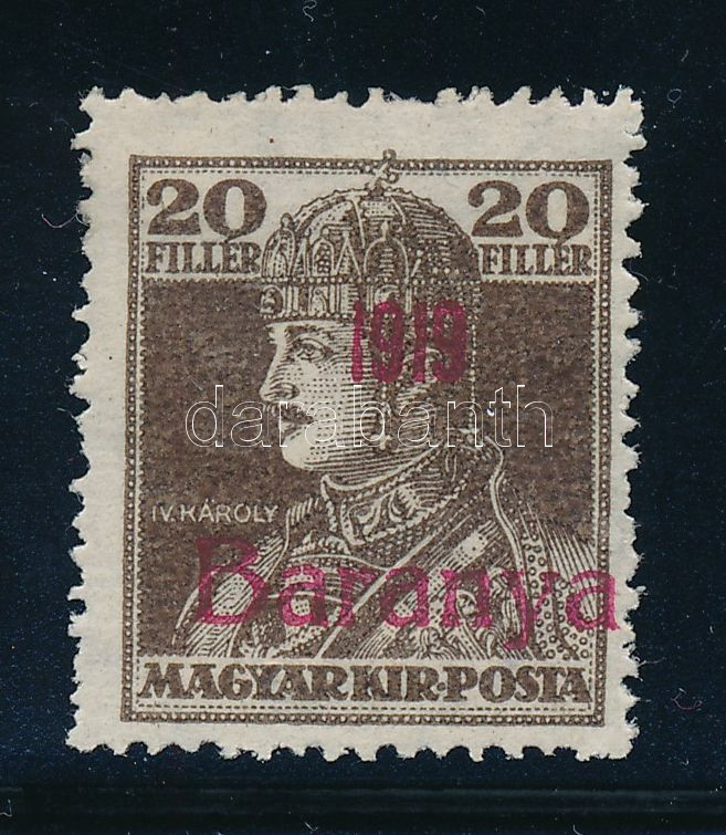 https://www.darabanth.com/en/512-Online-auction/512.0/Hungarian-philately-and-postal-history/Occupation-and-local-issues-1919-1921-with-guarantee~628/Baranya-I-1919-Karoly-20f-probanyomat-voros-felulnyomattal-Bodor-vizsgalojellel-gumihiba-~II3460147