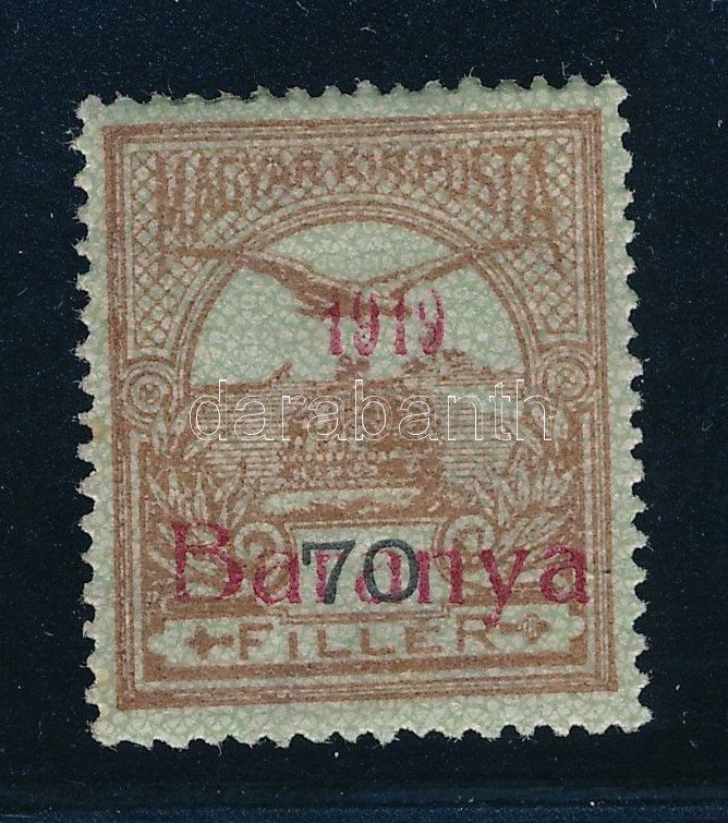 https://www.darabanth.com/en/512-Online-auction/512.0/Hungarian-philately-and-postal-history/Occupation-and-local-issues-1919-1921-with-guarantee~628/Baranya-I-1919-Turul-70f-halvany-felulnyomattal-Bodor-vizsgalojellel~II3460154