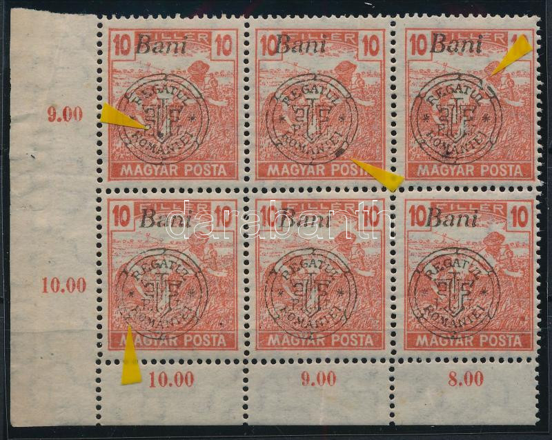 Nagyvárad 1919 Magyar Posta 10f ívsarki 6-os tömb lemezhibákkal, Bodor...