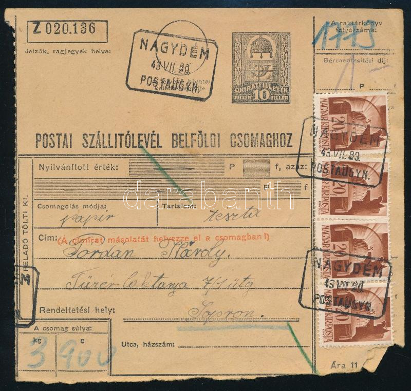 1943 Csomagszállító 5 bélyeggel és "NAGYDÉM" postaügynökségi bélyegzéssel