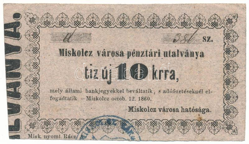 1860. Miskolc 10kr "Miskolcz város utalványa" bélyegzéssel, ...