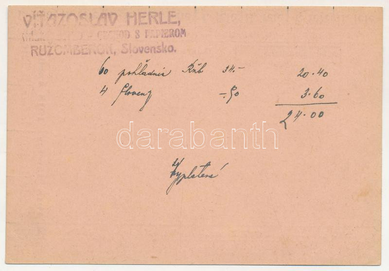 Description: 1917. Rózsahegy burgonyajegy, kitöltetlen, hátoldalán "VÍŤAZOSLAV HERLE, kníhkupectvo OBCHOD S PAPIEROM, RUŽOMBEROK, Slovensko " bélyegzéssel és szlovák nyelvű feljegyzéssel T:AU