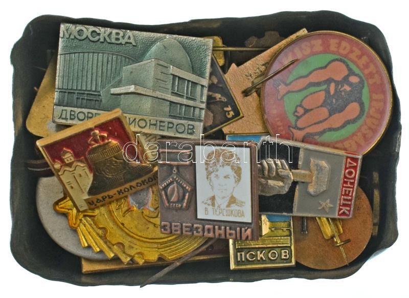 kb. 100db vegyes, magyar és külföldi jelvényből álló tétel fém dobozban T:vegyes, közte sérült darabok is