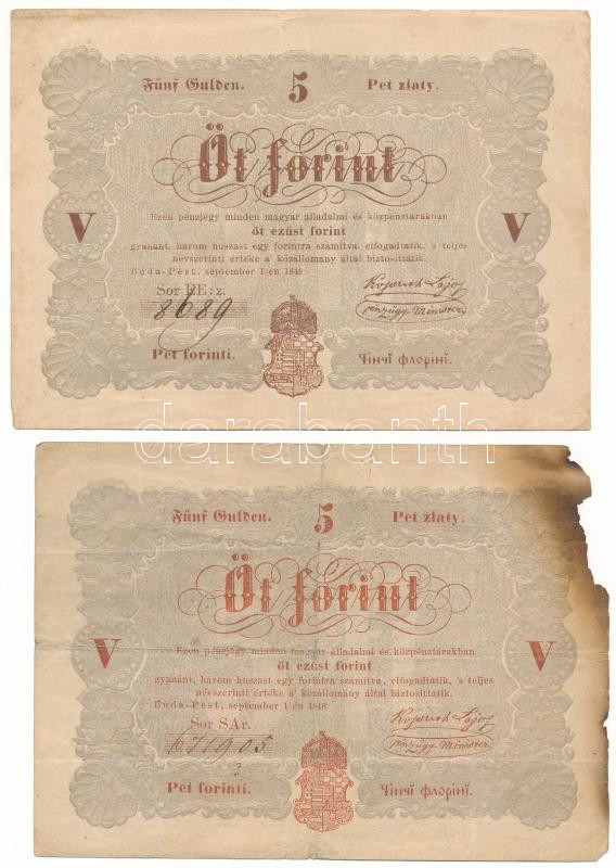 https://www.darabanth.com/en/512-Online-auction/512.0/Numismatics/Hungarian-Banknotes~235/1848-5Ft-Kossuth-banko-vorosesbarna-es-barna-nyomat-2xklf-TF-G-egyiknel-anyaghiany3Cbr-3E~II3456049