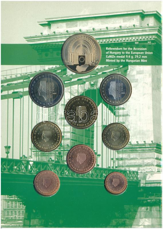 Netherlands 2003. 1 Cent - 2 Euro (8xdiff) + "Referendum for the Accession of Hungary to the European Union" Cu-Ni-Zn commemorative medal (29,2mm), "Hungarian National Bank Information Set" coin set in cardboard case, in Hungarian and in English language C:PP