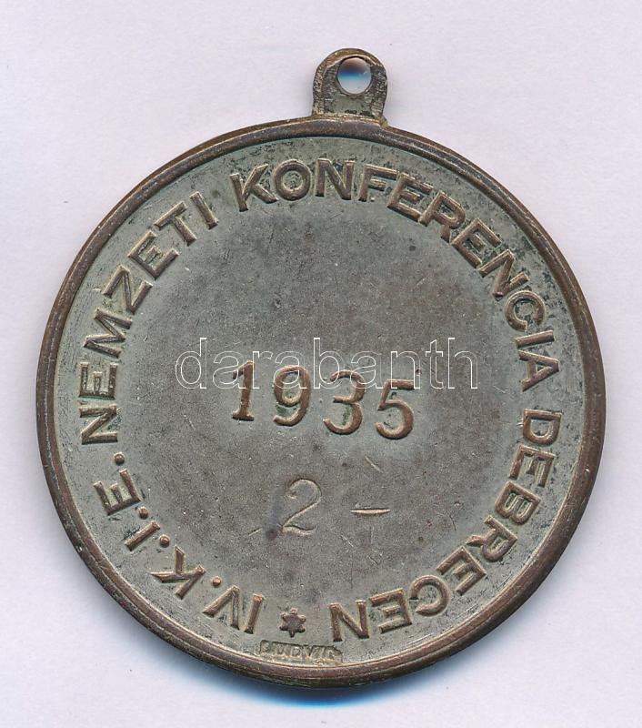 Description: 1935. "America - Europa - Asia - Oceania - Africa / IV. K.I.E. (Keresztény Ifjúsági Egyesület) Nemzeti Konferencia Debrecen " kétoldalas ezüstözött bronz emlékérem füllel, "Ludvig" gyártói jelzéssel és gravírozott "2" számmal (40mm) T:XF kopott ezüstözés