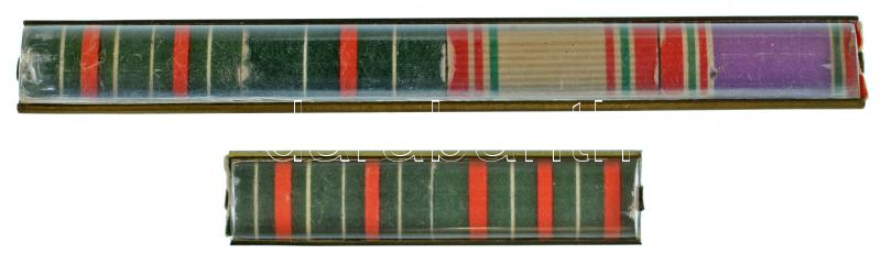 Description: Szalagsávok plasztikkal védett fémcsaton: "Szolgálati Érdemérem" 25 év után + 15 év után + "A Vám- és Pénzügyőrségi Szolgálati Érem" arany fokozata + ezüst fokozata (2x) + bronz fokozata (egy három sávos és egy kettes sávos csat) T:XF