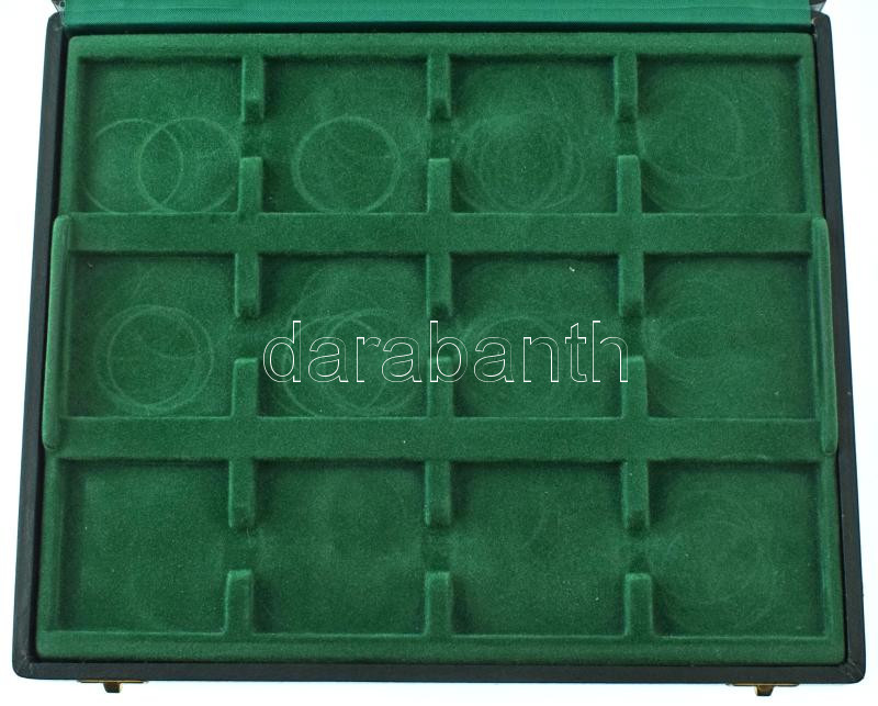 Használt, zöld, műbőr érmetartó kazetta, egy beépített és egy kivehető tálcával, összesen 24db férőhellyel.