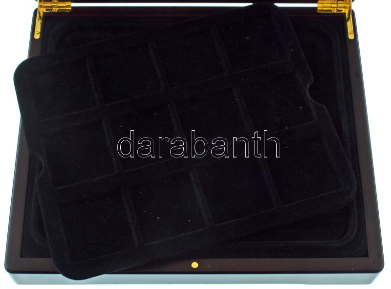 Description: Mahagóni fa érmetartó kazetta bársonybéléssel, 1db beépített + 2db kivehető tálcával, összesen 24db ~50mm-es és 1db ~205x145mm-es férőhellyel. Használt, de jó állapotban (külső méretek: ~285x245x55mm)