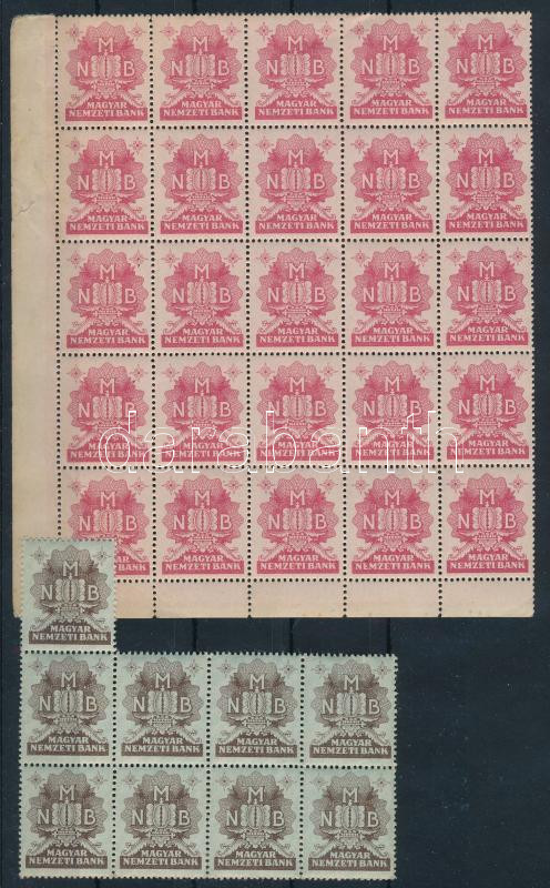 Description: 1946. "MNB" dézsmabélyeg, piros, ívszéli bélyegek (25x), néhány helyen elvált fogakkal + "MNB" dézsmabélyeg, barna bélyegek (9x), néhány helyen elvált fogakkal
