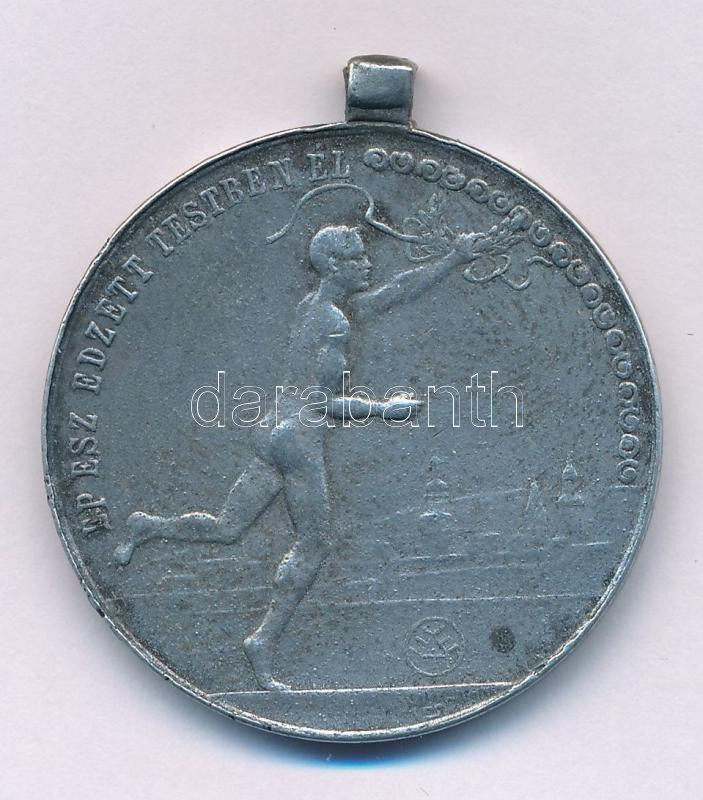 Description: 1920 k. "A Soproni Áll. Széchenyi I. Reálisk. Turul Sportkörének Versenydíja - 1912 / Ép ész edzett testben él " ezüstözött bronz díjérem füllel, szign.: Schwerak (36mm) T:VF patina