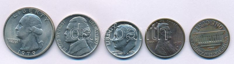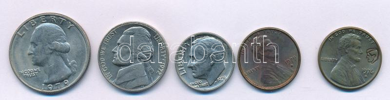 Description: Amerikai Egyesült Államok 1972-1979. 1c-1/4$ (4xklf) mindkét oldalán azonos előlapi verettel (portréoldal)! + 1976. 1c bronz "Lincoln" benne "Kennedy portré" beütéssel T:AU,XF