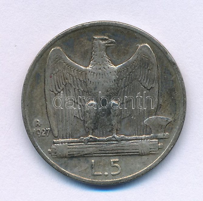 https://www.darabanth.com/en/512-Online-auction/512.0/Numismatics/Worldwide-silver-and-metal-coins~243/Olaszorszag-1927R-5L-Ag-3Cem3EIII-Viktor-Emanuel3Cem3E-TXF-VF-patina3Cbr-3E-Italy-1927R-5-Lire-Ag~II3407342