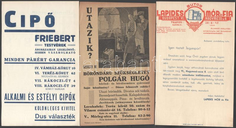 3 db reklámnyomtatvány (Lapides Mór és Fia Bútor, Friebert Cipő, Polgár Hugó bőröndáru)