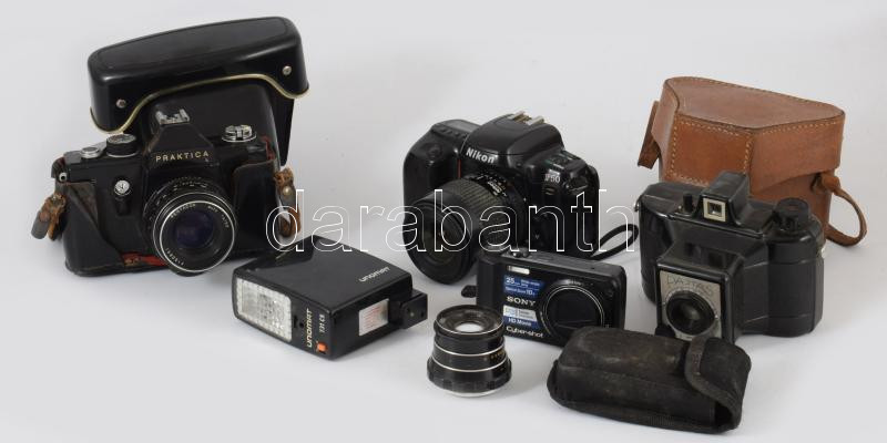 VEgyes kamerák, javítandók. Pentacon Praktica L fényképezőgép, Carl Zeiss Jena Tessar 50mm f/2.8 objektívvel, eredeti tokjával. + Nikon F50, Indusztár 61 objektív Pajtás fényképezőgép