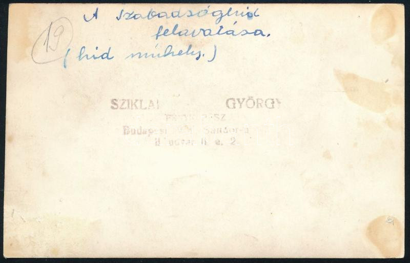 1946 Bp., az újjáépített Szabadság híd felavatására összegyűlt tömeg, a hátoldalon feliratozott, pecséttel jelzett fotó, 8,5x13,5 cm