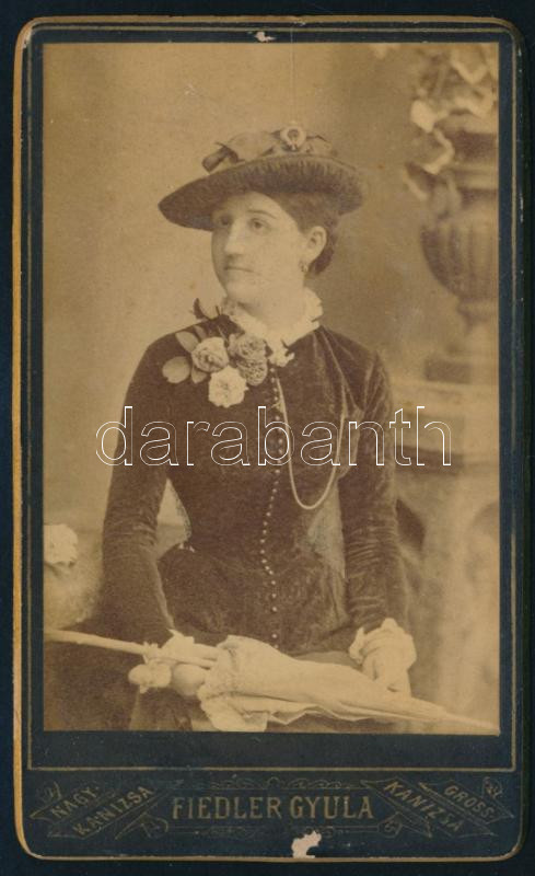cca 1880 Elegáns fiatal hölgy kalapban, virágokkal, napernyővel, vizit... https://www.darabanth.com/en/512-Online-auction/512.0/Photography/Photo~687/cca-1880-Elegans-fiatal-holgy-kalapban-viragokkal-napernyovel-vizitkartya-Fiedler-Gyula-nagy~II3402932