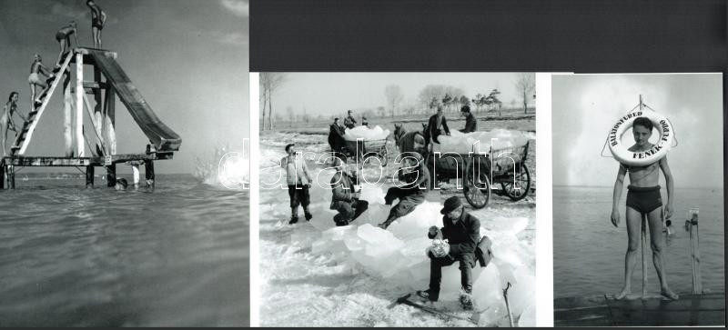 Description: cca 1960 előtti felvételek a Balatonról (Jégvágó brigád; Csúszda Balatonalmádiban; Mentőöv Balatonfüred-Fenékfürdő strandján), 3 db modern nagyítás, jelzés nélkül, 15x10 cm és 21x15 cm és 15x21 cm