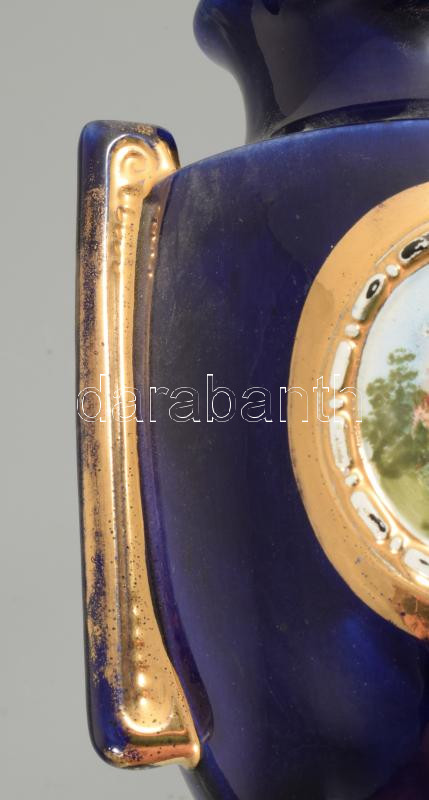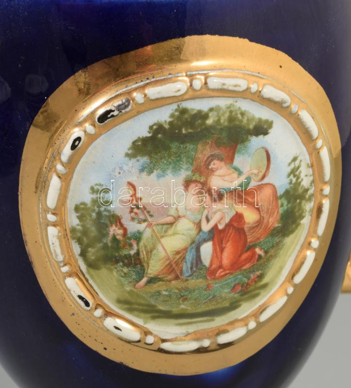 Cseh alt wien kétfüles váza, historizáló jelenettel, gyári mázhibával, kopással, m: 25,5 cm