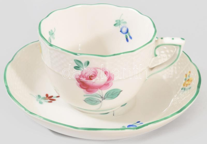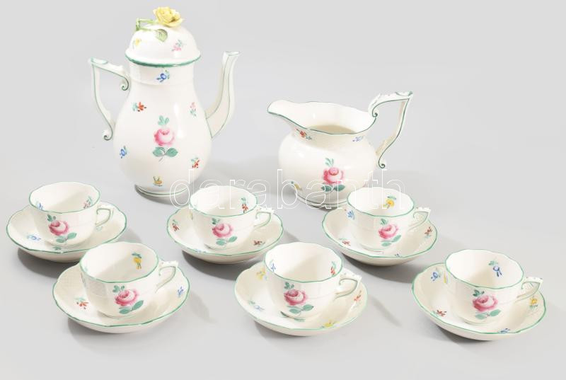 Óherendi bécsirózsás mokkás / kávés készlet. Jelzett, rózsafogó sérült, cukortartó hiánnyal, egyik csészén mázhibával.
