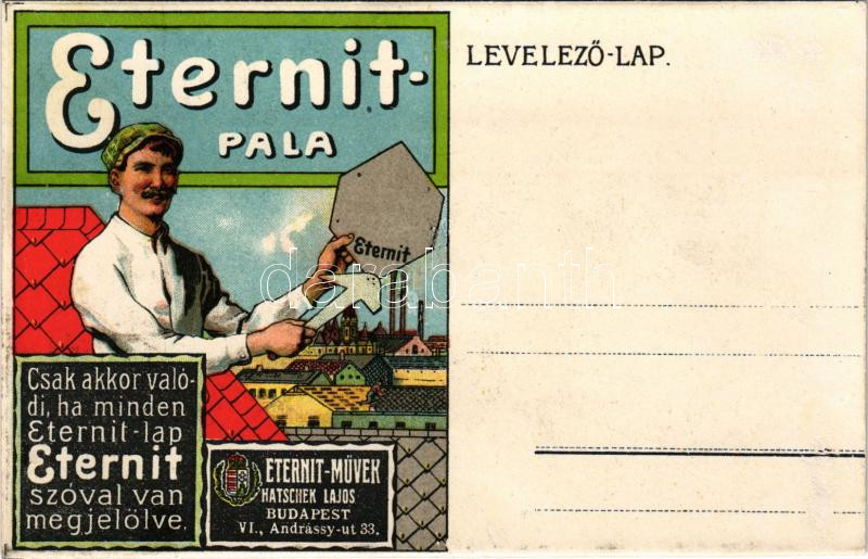 Eternit-Pala. Hatschek Lajos Eternit-Művek reklámlapja. Budapest VI. A... https://www.darabanth.com/en/512-Online-auction/512.0/Postcards/Advertisement~183/Eternit-Pala-Hatschek-Lajos-Eternit-Muvek-reklamlapja-Budapest-VI-Andrassy-ut-33-Hatoldalon~II3429208