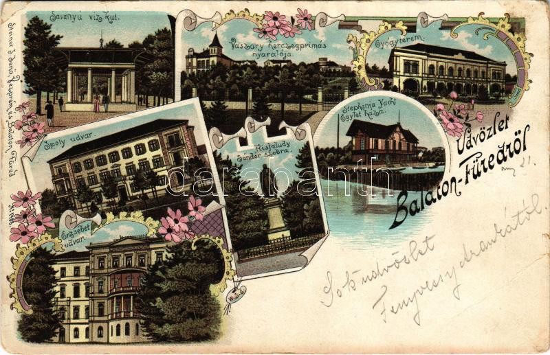 1898 Balatonfüred, Savanyú vízkút, Ipoly udvar, gyógyterem, Erzsébet udvar, Kisfaludy Sándor szobor, Stephania Yacht Egylet háza, Vaszary hercegprímás nyaralója. Steiner I. Jenő Art Nouveau, floral, litho (EB)