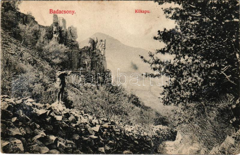 Badacsony, Kőkapu, vadász puskával. Mérei Ignác kiadása (EB)