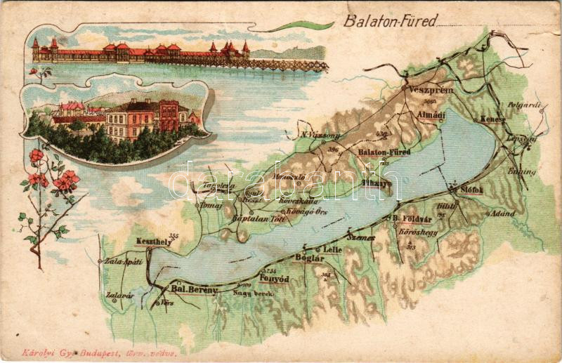 Balatonfüred, Balaton térkép, szálloda, villa, fürdő. Károlyi Gy. kiadása. Art Nouveau, floral, litho (szakadás / tear)