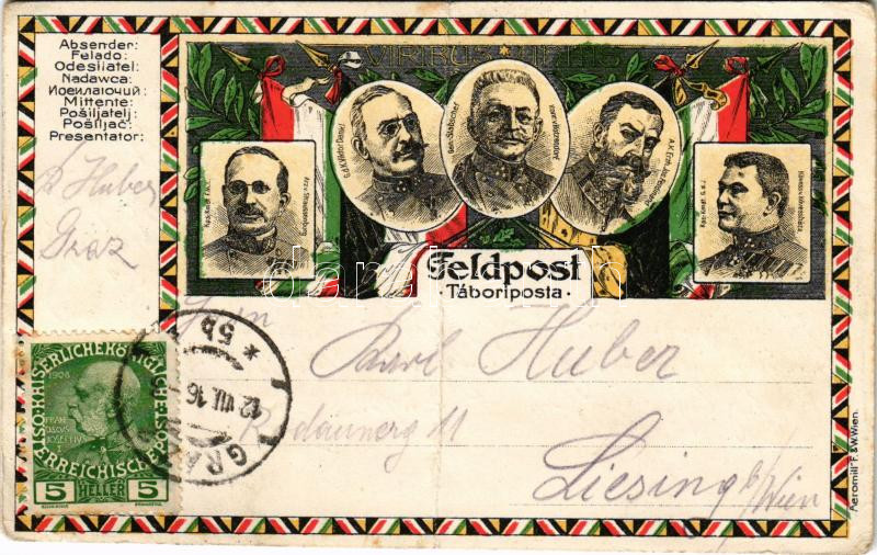 Description: 1916 Viribus Unitis Tábori Posta: Arz. v. Straussenburg, Konr. v. Hötzendorf, Viktor Dankl, Erzh. Jos. Ferdinand, Kövess v. Kövessháza - Első világháborús katonai lap / WWI Austro-Hungarian K.u.k. military, leaders, Feldpost (non PC) (fa)