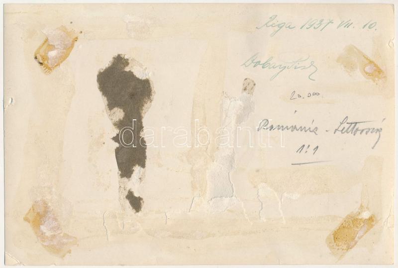 1937 Riga, Románia - Lettország 1:1 válogatott labdarúgó mérkőzés, a román csapat, csoportkép, Dobay István, Metropol szálloda, trolibusz, focisták / Romania - Latvia 1:1 football match, group picture of the Romanian team, Stefan Dobay, hotel, trolleybus, sport photo (17,6 x 11,9 cm) (b)