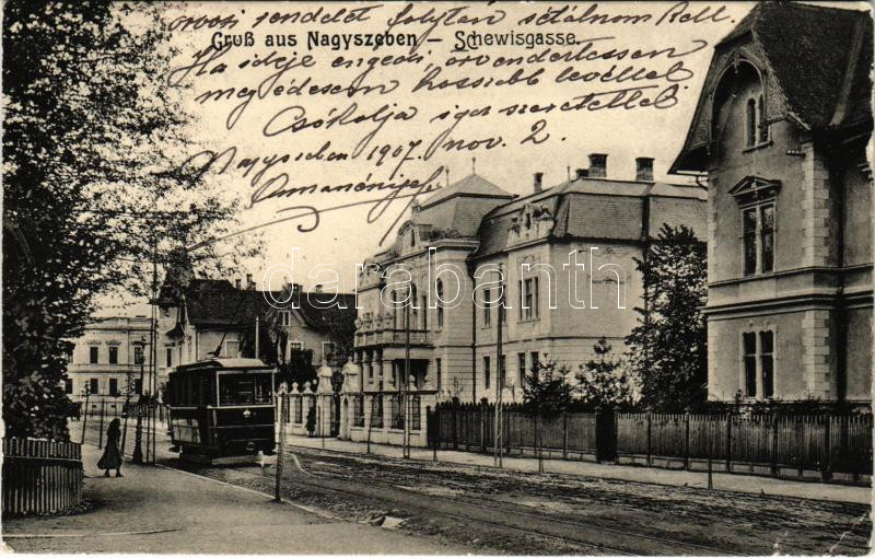 https://www.darabanth.com/en/512-Online-auction/512.0/Postcards/Transylvania~104/1907-Nagyszeben-Hermannstadt-Sibiu-Schewisgasse-utca-villamos-street-tram-azott-wet-dam~II3460088