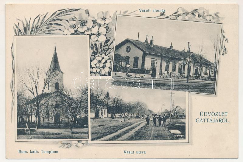 Description: 1911 Gátalja, Gáttája, Gataia; Római katolikus templom, Vasút utca, vasútállomás. Szecessziós-virágos keret / Catholic church, street view, railway station. Art Nouveau, floral frame